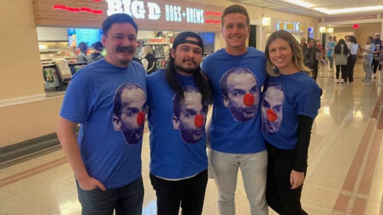 他說,進(jìn)場時有人要求他摘下帽子,他拒絕了,但還是被放了進(jìn)去。里迪則另有計(jì)劃。在他的法蘭絨襯衫里面,穿著好幾件印有哈里森頭像并畫著紅色小丑鼻子的T恤。