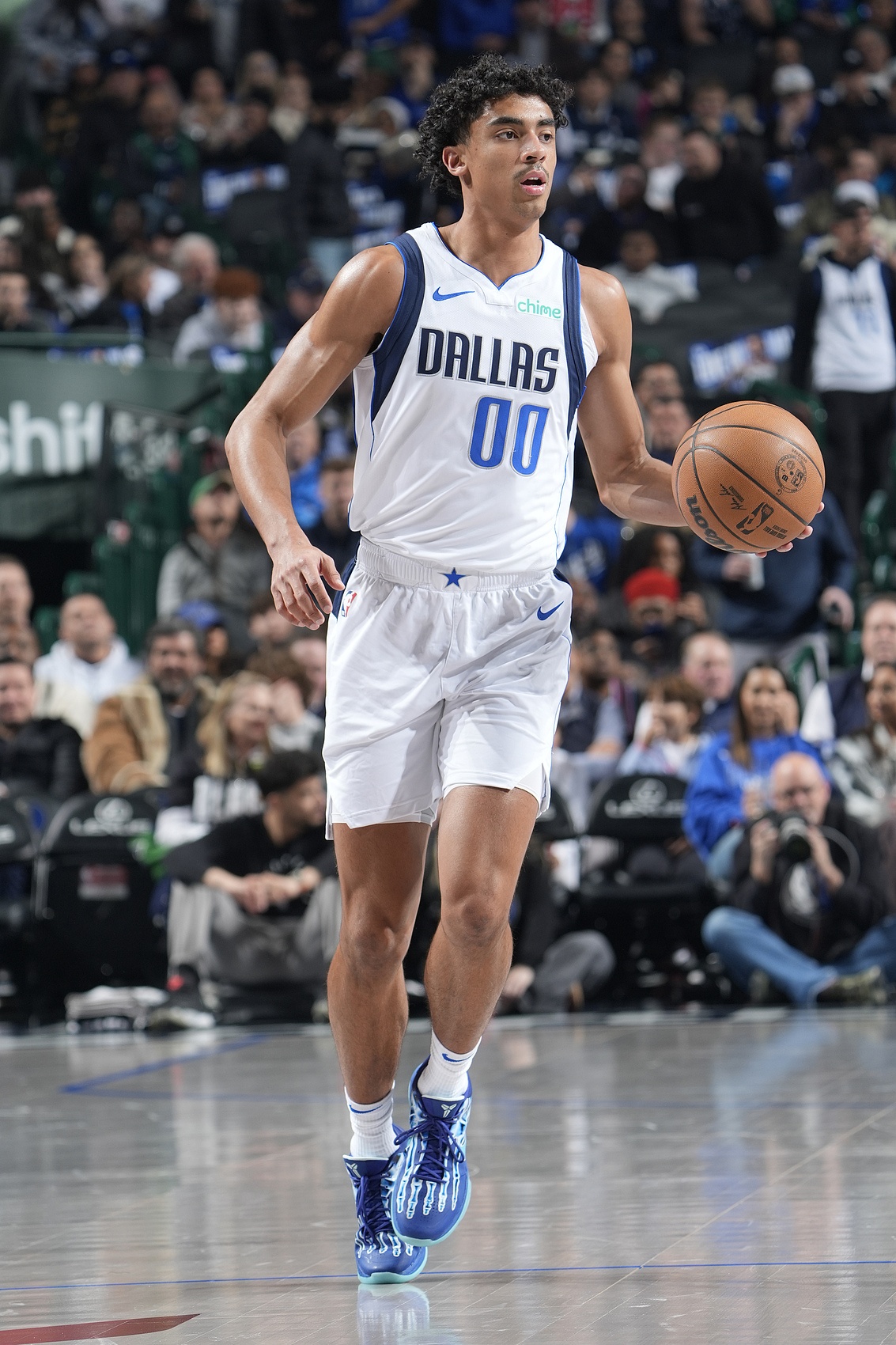 在全明星周末前,球館內(nèi)的任何一家球隊(duì)商店里,都找不到東契奇的周邊商品,哪怕是打折出售的也沒有。球隊(duì)賽前的精彩集錦視頻中,幾乎看不到東契奇的畫面,甚至連背景中都很少出現(xiàn)。在球館里,他留下的痕跡寥寥無幾。在122區(qū)附近的走廊展示區(qū),有一張照片,畫面模糊,東契奇在背景中看著另一位前獨(dú)行俠球員杰倫-布倫森沖向籃筐。
