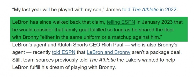 2022年2月,詹姆斯在接受The Athletic采訪時第一次談到父子同臺的愿望:“我在生涯最后一年會和我兒子一起打球,無論布朗尼在哪里,我都會去那個地方。我愿意做任何事情來實現(xiàn)與我的兒子一起打球一年。屆時錢也就不重要了?!?/p>
