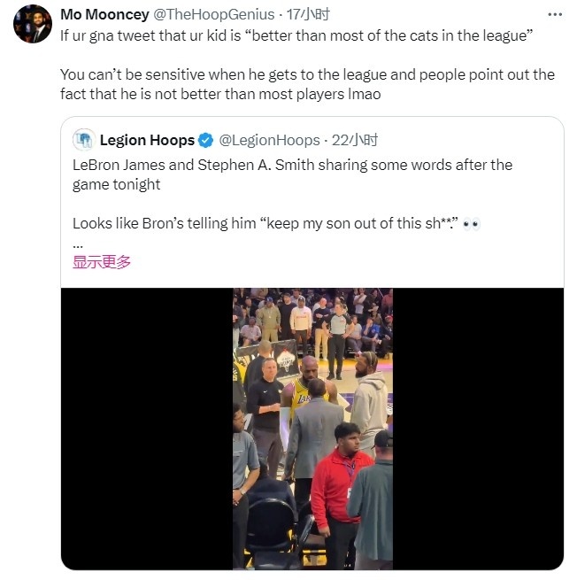 在2023年3月6日,詹姆斯發(fā)推寫道:“天啊,布朗尼絕對強于今天我在聯(lián)盟通(注:NBA官方比賽直播服務(wù))上看到的一些阿貓阿狗。這場面真的有點好笑????????????????”