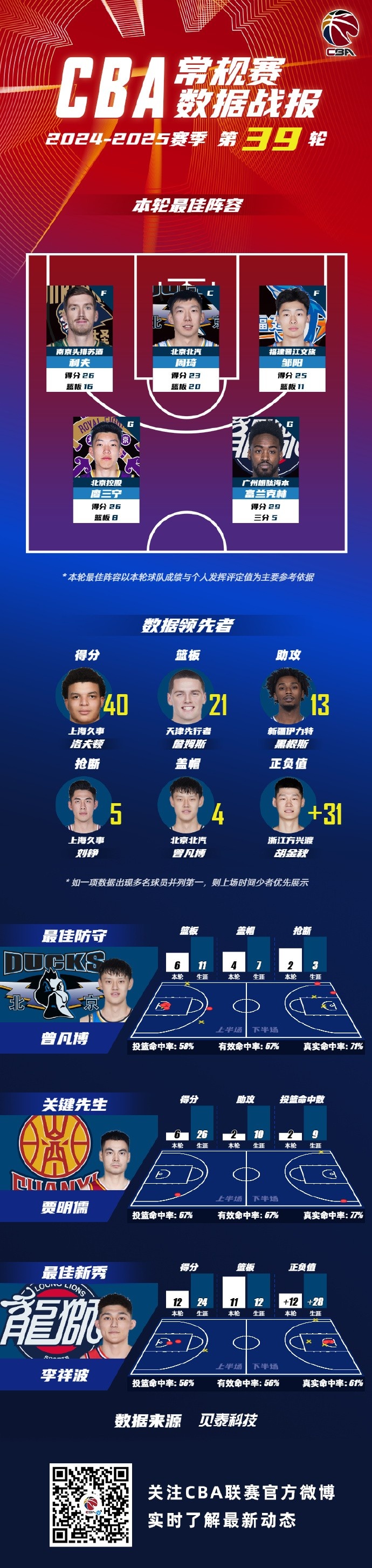 2024-2025賽季CBA聯(lián)賽常規(guī)賽第39輪結束較量,來自南京同曦籃球俱樂部的利夫,北京首鋼籃球俱樂部的周琦,福建潯興SBS男籃的鄒陽,北京控股籃球俱樂部的廖三寧和龍獅籃球俱樂部的富蘭克林入選CBA聯(lián)賽常規(guī)賽第39輪最佳陣容!