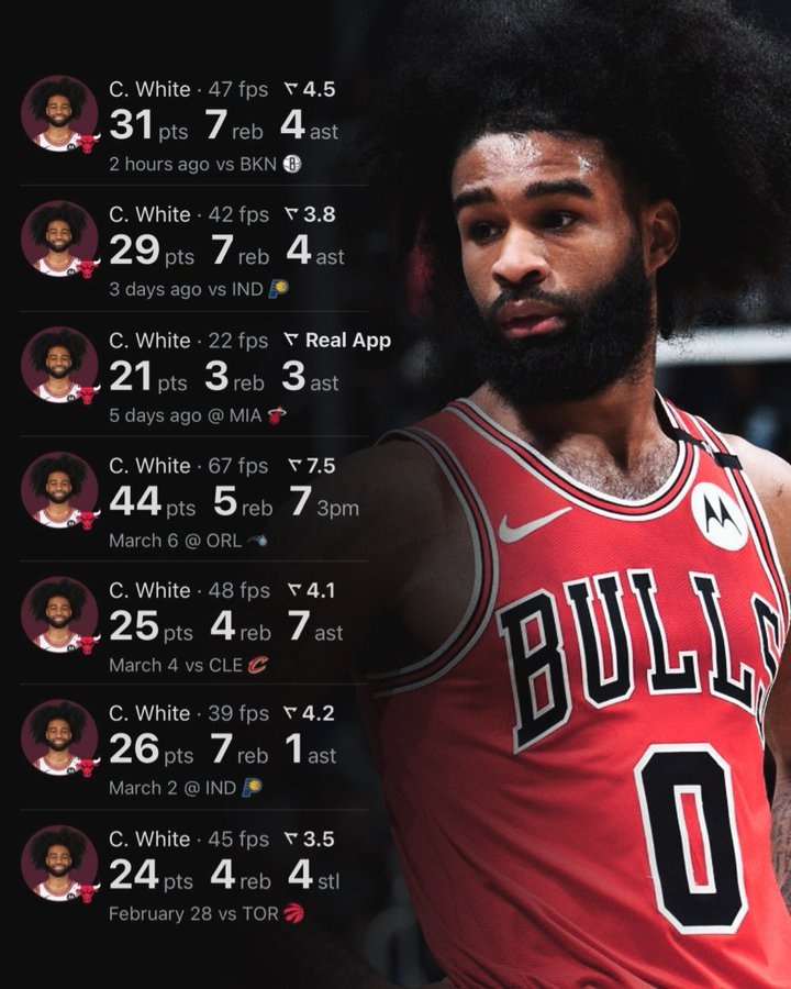 此役公牛后衛(wèi)科比-懷特火力全開,打了36分鐘24投12中,三分8中3、罰球4中4砍全場最高31分外加7籃板4助攻1搶斷,正負值+7。
