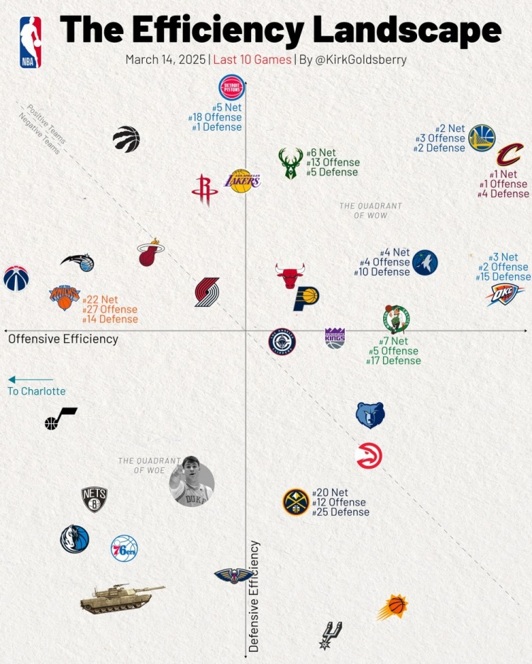 近10場攻防效率:騎士與活塞分別領銜攻防 勇士攻防均排名前三