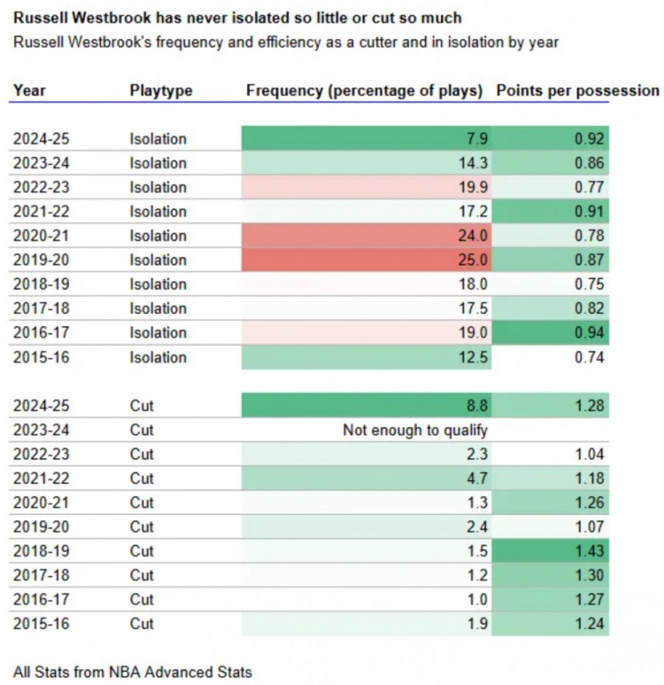與此同時,威少有8.8%的回合以空切結(jié)束,每次空切出手機會能得到1.28分。這一空切頻率也遠遠高于威少職業(yè)生涯的其他時期,并且首次超過了他的單打頻率(7.9%)。