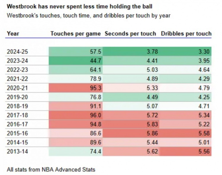 (圖為威少十多年來的持球情況:第一列為賽季,第二列為場均觸球次數(shù),第三列為每次觸球時間,第四列為每次觸球運球次數(shù))