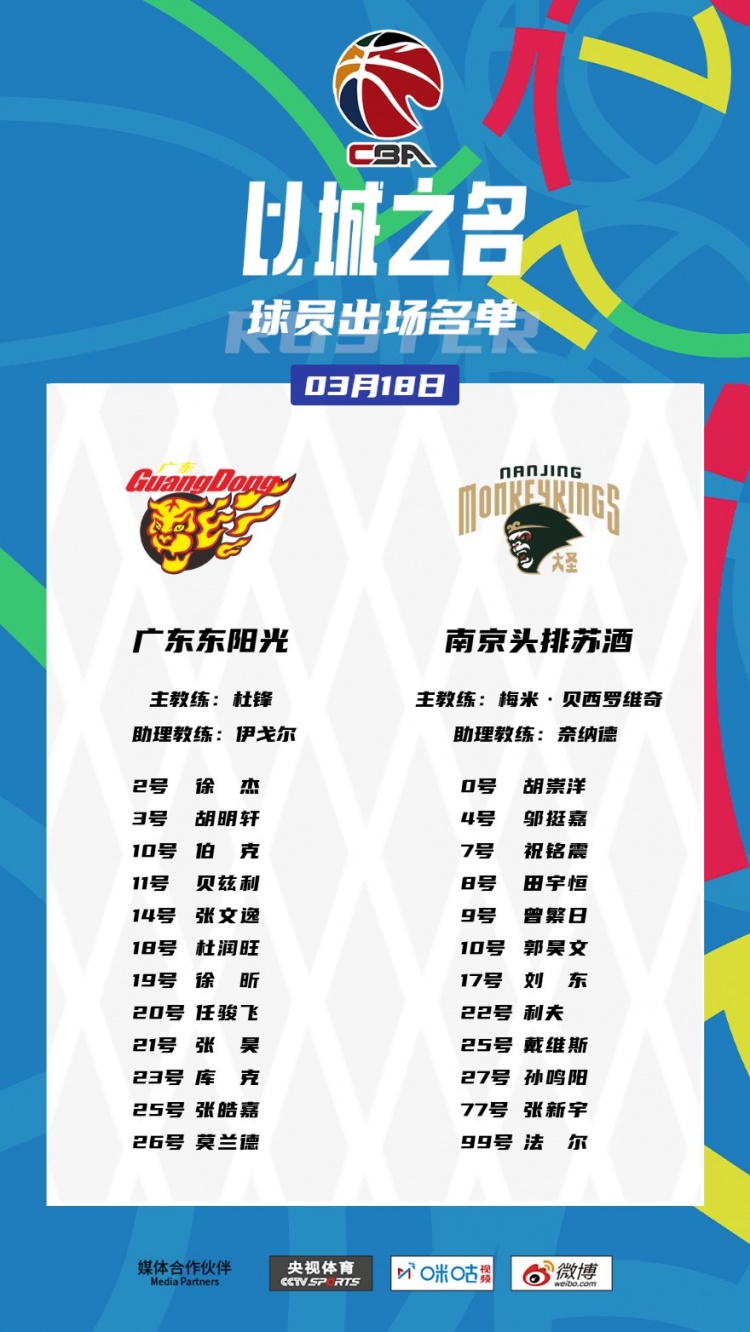 廣東VS同曦大名單:徐杰胡明軒徐昕領(lǐng)銜 郭昊文法爾在列