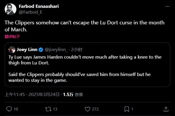 快船隊(duì)記Farbod Esnaashari發(fā)推表示:“快船在三月份似乎無法擺脫盧-多特的魔咒?!?/p>
