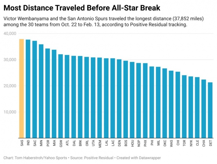 全明星前旅行最遠(yuǎn)距離:根據(jù)Positive Residual的追蹤,文班亞馬和馬刺從10月22日到2月13日之間,旅行的總距離(37,852英里)在30支球隊(duì)中排名第一。