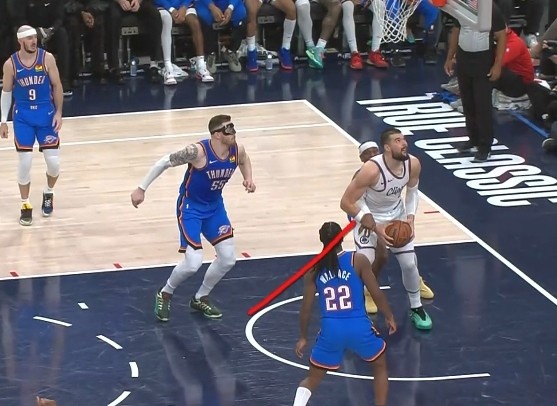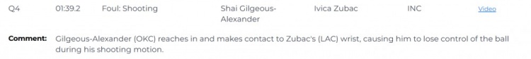 比賽最后1:39,快船落后99-100落后1分,亞歷山大(雷霆)伸手接觸到祖巴茨(快船)的手腕,導(dǎo)致他在投籃動(dòng)作中失去對(duì)球的控制。