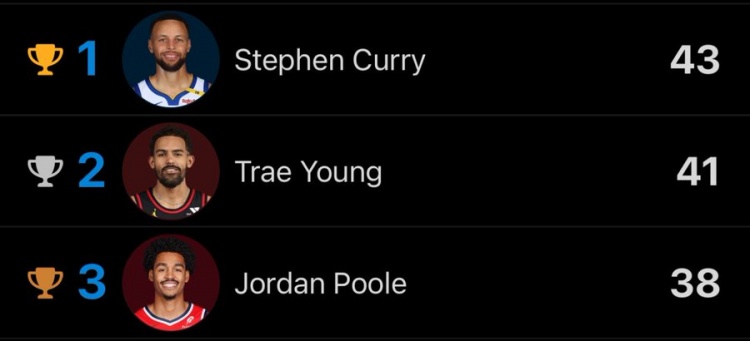 本賽季命中30+英尺投籃球員前3名:庫里43記 特雷-楊41 普爾38
