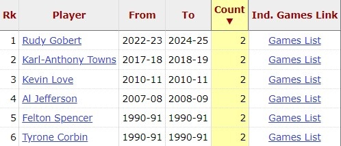 據(jù)統(tǒng)計(jì),這是戈貝爾到森林狼后第3次單場10+進(jìn)攻籃板,升至隊(duì)史第一。