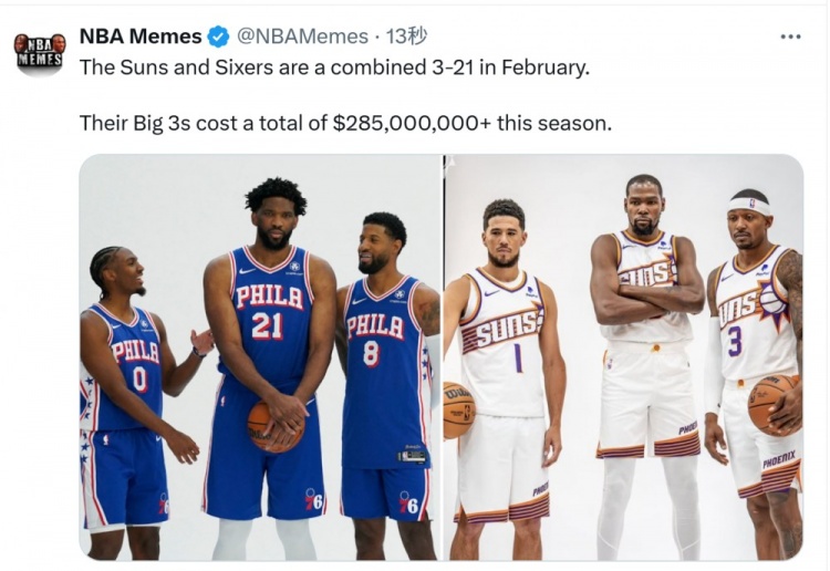 美媒NBA Memes:“太陽和76人二月份共計(jì)3勝21負(fù),而他們的三巨頭本賽季工資共計(jì)超過2.85億美元?!?/p>