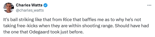 在賴(lài)斯進(jìn)球后,阿森納系的記者Charles Watts在社媒表示:“賴(lài)斯這樣的射門(mén)讓我困惑了,為什么獲得射程范圍以?xún)?nèi)的任意球時(shí)不讓他去主罰呢?之前厄德高主罰的那個(gè)任意球應(yīng)該讓他去踢?!?/p>