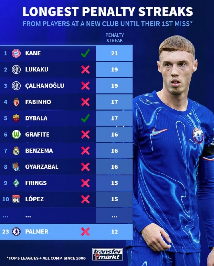 3月11日訊 切爾西在本輪英超1-0小勝萊斯特城,帕爾默罰丟點(diǎn)球,加盟切爾西后連續(xù)12次命中點(diǎn)球紀(jì)錄告終。