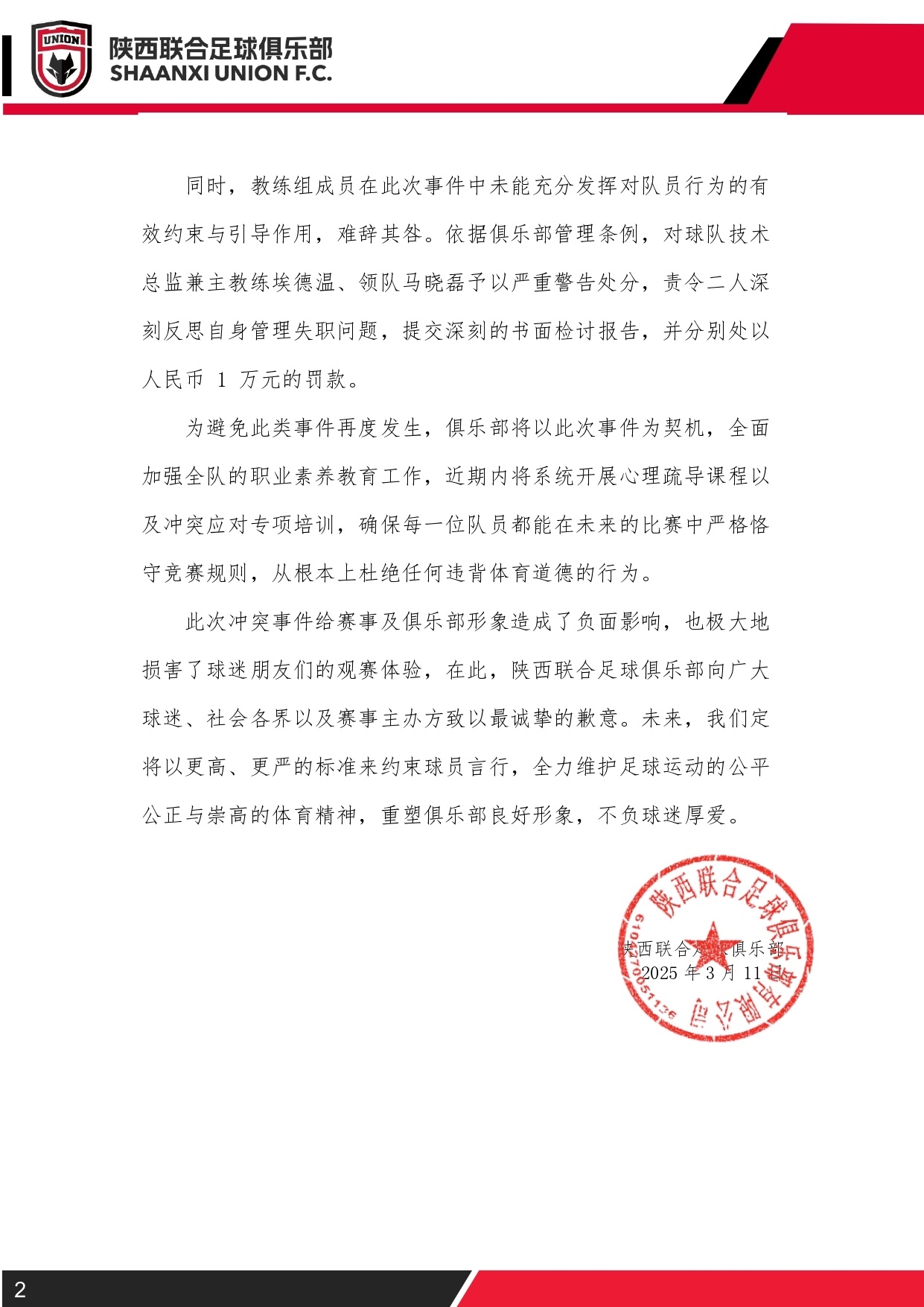 此次沖突事件給賽事及俱樂(lè)部形象造成了負(fù)面影響,也極大地?fù)p害了球迷朋友們的觀賽體驗(yàn),在此,陜西聯(lián)合足球俱樂(lè)部向廣大球迷、社會(huì)各界以及賽事主辦方致以最誠(chéng)摯的歉意。未來(lái),我們定將以更高、更嚴(yán)的標(biāo)準(zhǔn)來(lái)約束球員言行,全力維護(hù)足球運(yùn)動(dòng)的公平公正與崇高的體育精神,重塑俱樂(lè)部良好形象,不負(fù)球迷厚愛(ài)。