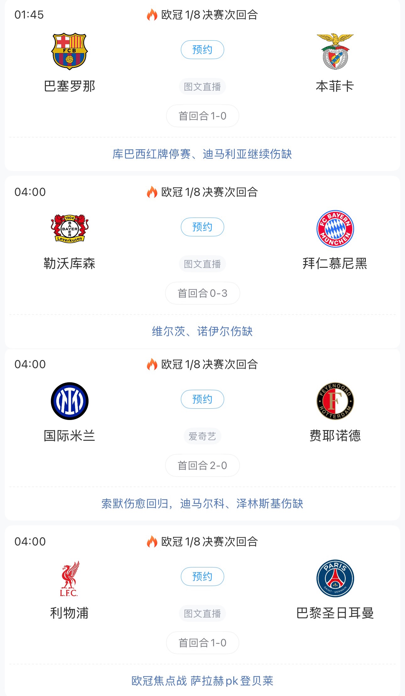 北京時(shí)間明天凌晨,歐冠1/8決賽次回合開打,利物浦大戰(zhàn)巴黎,薩拉赫與登貝萊繼續(xù)“金球之爭”,拜仁與勒沃庫森上演德甲內(nèi)戰(zhàn),巴薩、國米出戰(zhàn)。四組對陣中會不會出現(xiàn)逆轉(zhuǎn)?今晚拭目以待!