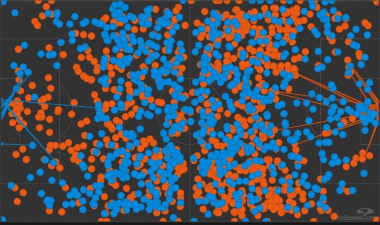 皇馬的比賽節(jié)奏在于邊路的機(jī)會(huì),第一戰(zhàn)他們總共的642次傳球有218次發(fā)生在進(jìn)攻三區(qū),這比馬競(jìng)要高出不少。其中,左右路傳遞次數(shù)則占據(jù)了他們?cè)谶M(jìn)攻三區(qū)的大部分選擇,再加上他們本賽季其他比賽的數(shù)據(jù)分析可確定,這就是皇馬的比賽風(fēng)格。
