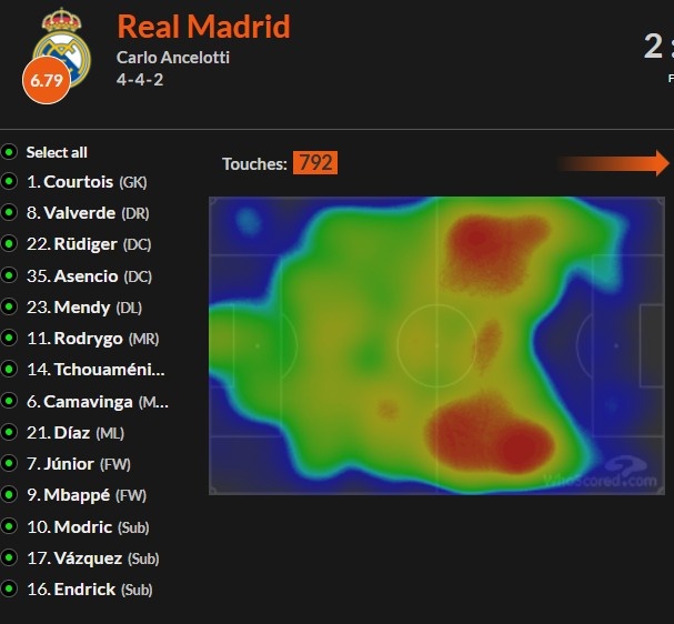 可以想到,因?yàn)樵谌鄙俅笾袖h的情況下,他們不可能按照過(guò)去有中鋒時(shí)(哪怕是何塞-盧)那樣的傳中、搶點(diǎn)、后排套上爭(zhēng)搶機(jī)會(huì)模式來(lái)打了。維尼修斯、羅德里戈、包括姆巴佩都是在突擊方面遠(yuǎn)勝過(guò)被迫的站樁方面效率選手,因此,他們也會(huì)自主扯到邊路來(lái)踢球。
