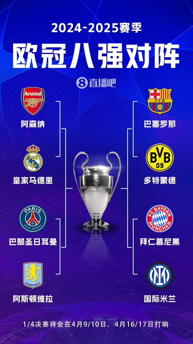 3月13日訊 歐冠16強戰(zhàn)已全部結(jié)束,歐足聯(lián)官網(wǎng)也公布了歐冠1/4決賽賽程,以下開球時間皆為北京時間。