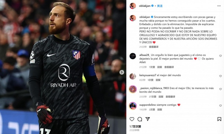 3月13日訊 馬競在本輪歐冠主場被皇馬點球淘汰,門將奧布拉克在不久前通過社媒發(fā)文。