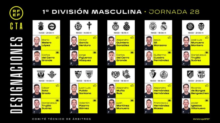 3月13日訊 西甲第28輪聯(lián)賽各場執(zhí)法裁判公布,曼薩諾執(zhí)法比利亞雷亞爾vs皇馬,本戈切亞執(zhí)法馬競vs巴薩。