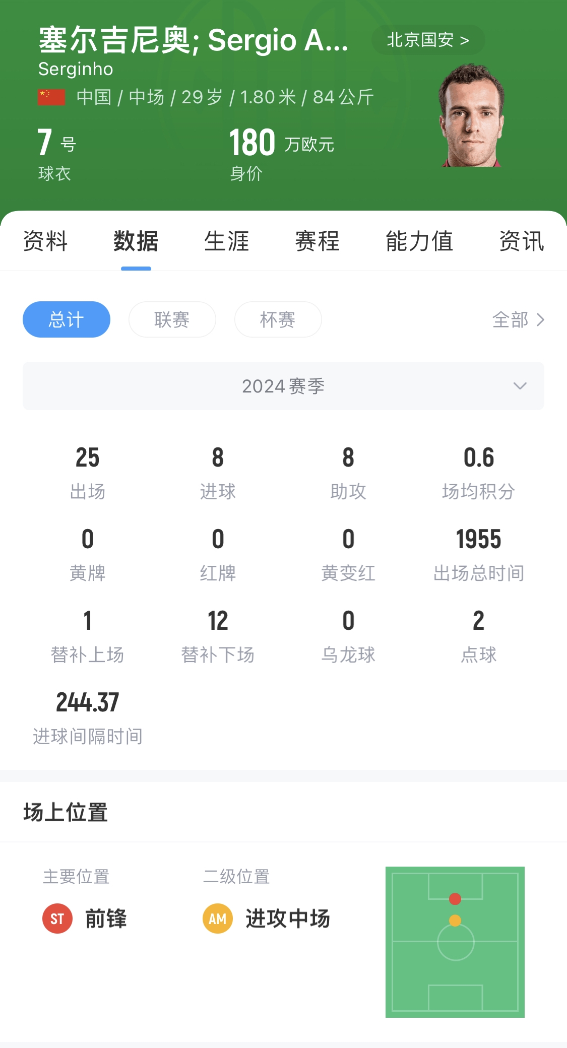 1995年3月15日出生的塞爾吉尼奧原來?yè)碛邪臀骱鸵獯罄p重國(guó)籍,2020年1月加盟長(zhǎng)春亞泰,代表球隊(duì)出戰(zhàn)100場(chǎng)打進(jìn)30個(gè)進(jìn)球,完成23次助攻。2025賽季以40萬歐元的身價(jià)轉(zhuǎn)會(huì)至北京國(guó)安。轉(zhuǎn)換會(huì)籍成功的第二天,塞爾吉尼奧也將迎來自己的30歲生日。