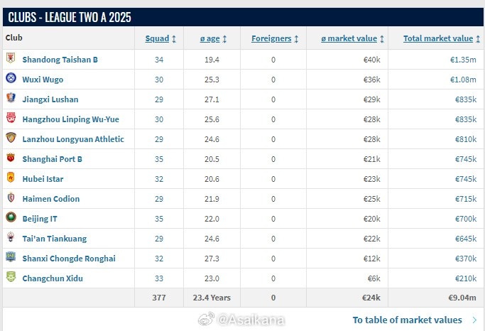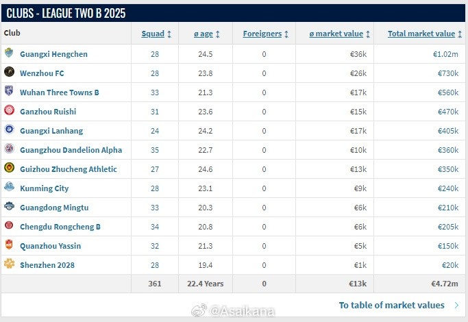 2025賽季中乙各隊名單已在轉(zhuǎn)會市場網(wǎng)更新。球隊總身價方面,山東泰山B隊以135萬歐元列第一,后面依次是無錫吳鉤(108萬歐)、廣西恒宸(102萬歐)、江西廬山(83.5萬歐)、杭州臨平吳越(83.5萬歐)、蘭州隴原競技(81萬歐)、上海海港B隊(74.5萬歐)、湖北青年星(74.5萬歐)、溫州(73萬歐)、南通海門珂締緣(71.5萬歐)、北京理工(70萬歐)、泰安天貺(64.5萬歐)、武漢三鎮(zhèn)B隊(56萬歐)、贛州瑞獅(47萬歐)、廣西藍(lán)航(40.5萬歐)、山西崇德榮海(37萬歐)、廣州蒲公英(36萬歐)、貴州筑城競技(35萬歐)、昆明城市(24萬歐)、廣東銘途(21萬歐)、長春喜都(21萬歐)、成都蓉城B隊(20.5萬歐)、泉州亞新(15萬歐)、深圳二零二八(2萬歐)。