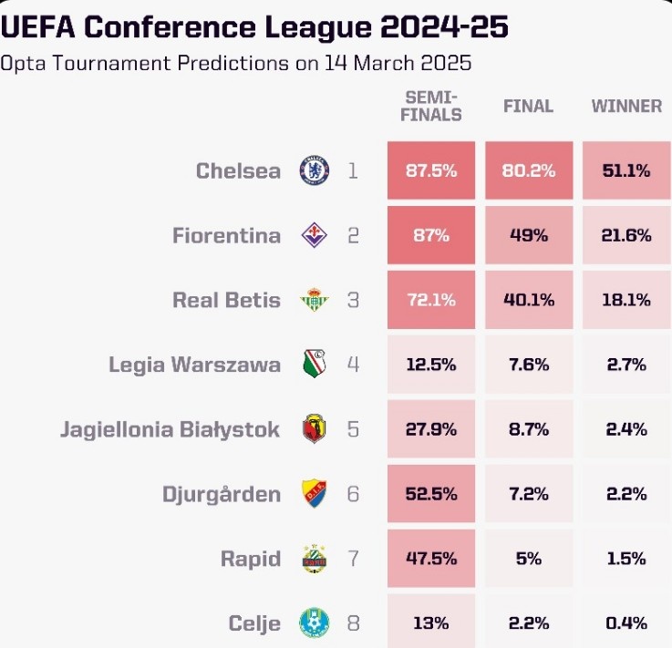 OPTA列本賽季歐協(xié)聯(lián)奪冠概率:切爾西大幅領(lǐng)跑,貝蒂斯第三