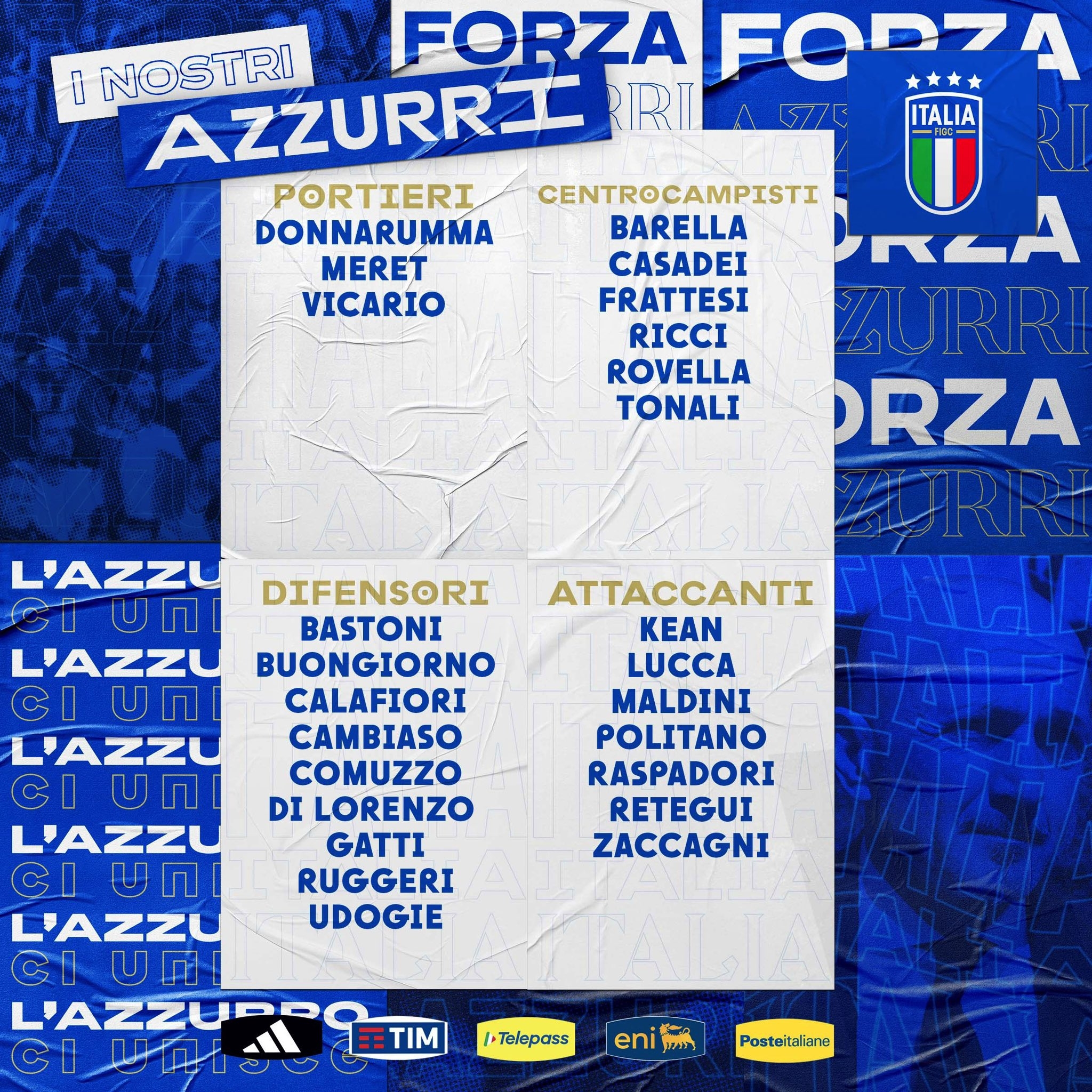 后衛(wèi):巴斯托尼(國(guó)米)、布翁喬爾諾(那不勒斯)、卡拉菲奧里(阿森納)、坎比亞索(尤文)、科穆佐(佛羅倫薩)、迪洛倫佐(那不勒斯)、加蒂(尤文)、魯杰里(亞特蘭大)、烏多吉(熱刺)