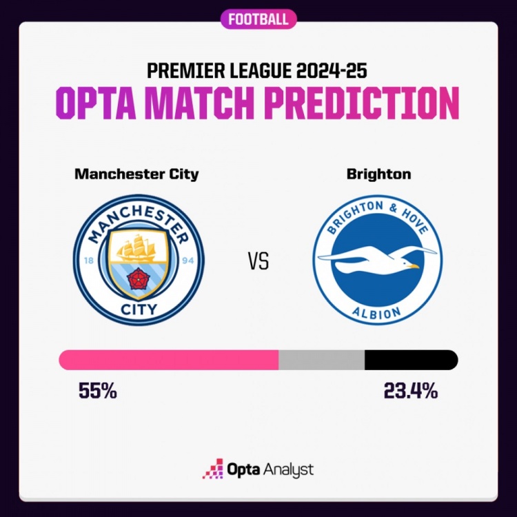 Opta對于本場比賽進行了超級計算機模擬預(yù)測,曼城獲勝概率55%,布萊頓獲勝概率23.4%,雙方戰(zhàn)平概率21.7%。