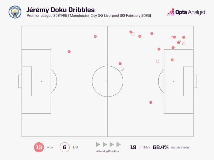 根據(jù)統(tǒng)計,多庫本場19次嘗試過人、13次成功,兩項數(shù)據(jù)均是英超本賽季的紀錄。
