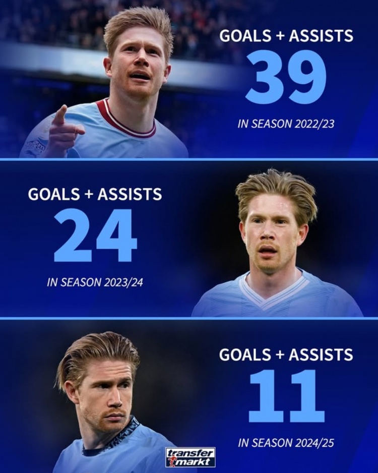 能否續(xù)約?33歲德布勞內(nèi)近3賽季參與進球數(shù)逐年下滑:39→24→11