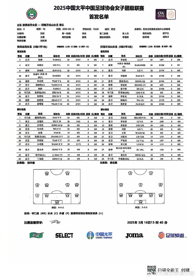 北京時間3月16日15:00,2025中國太平中國足球協(xié)會女子超級聯(lián)賽第三輪,河南萬仙山女足客場對陣陜西志丹女足。