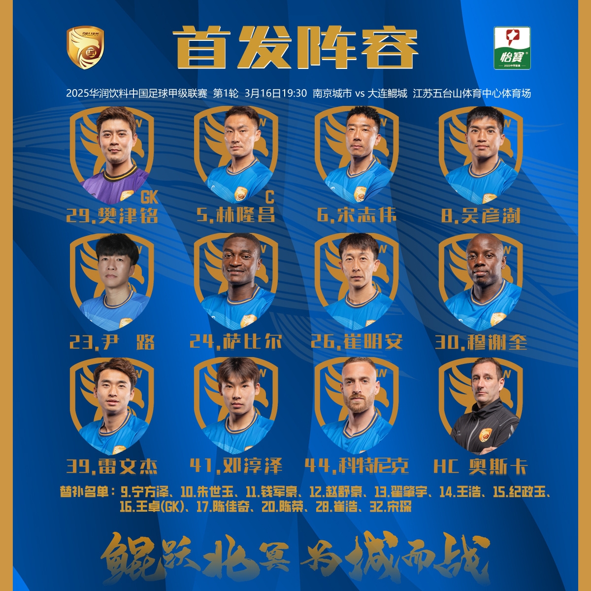 南京城市2025賽季首戰(zhàn)首發(fā)名單出爐!
