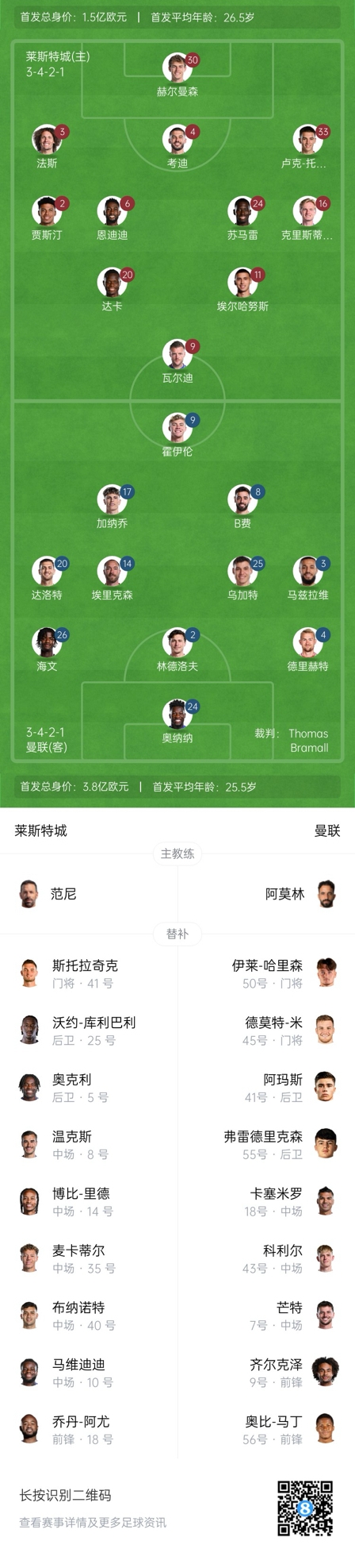 萊斯特城首發(fā):30-赫爾曼森、4-考迪、33-盧克-托馬斯、3-法斯、2-賈斯汀、16-克里斯蒂安森、6-恩迪迪、24-蘇馬磊、20-達(dá)卡、11-埃爾哈努斯、9-瓦爾迪