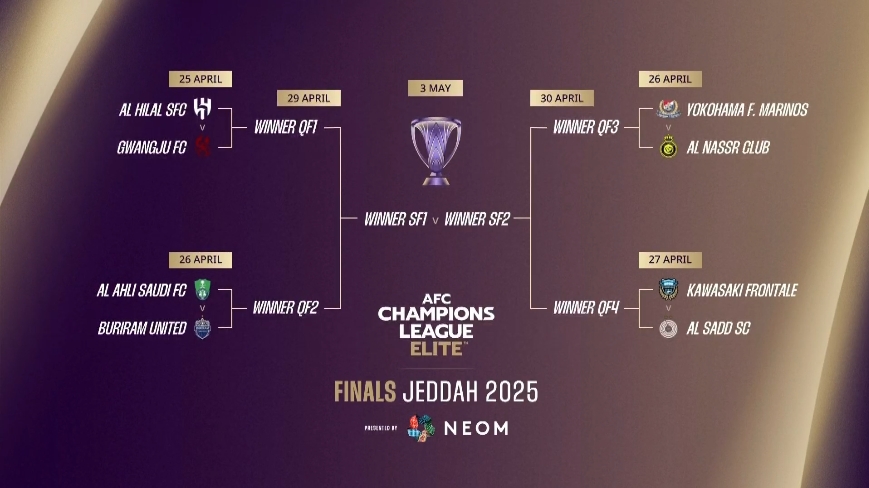 本賽季亞冠精英聯(lián)賽,從1/4決賽開(kāi)始為集中賽會(huì)制的單場(chǎng)淘汰賽,2025年4月25日至5月4日在沙特舉行。