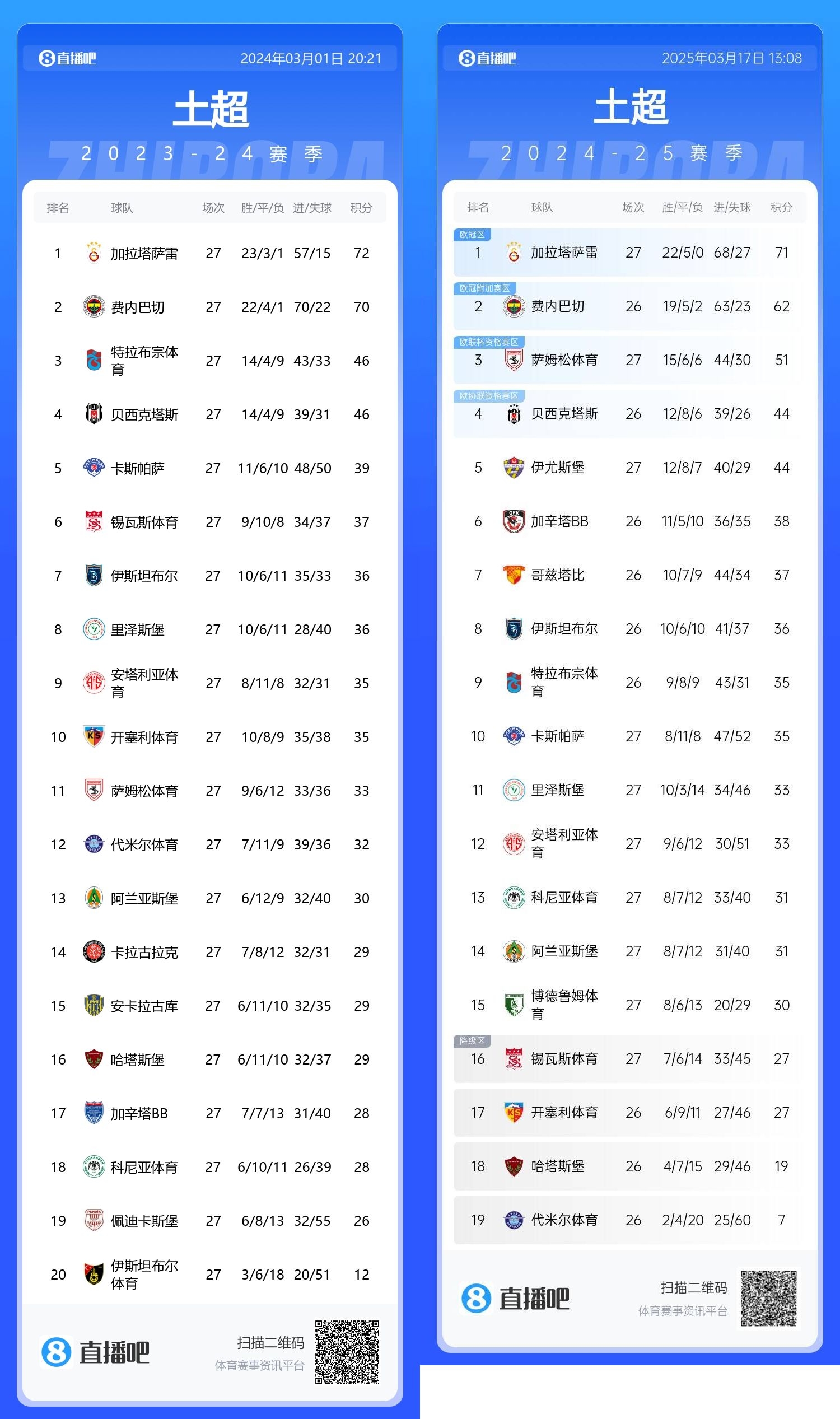 到了本賽季,加拉塔薩雷延續(xù)無敵的表現(xiàn),27場比賽后拿到71分,只比去年少1分,但費內(nèi)巴切卻有一些掉隊了。盡管目前費內(nèi)巴切少賽一場領(lǐng)先第3名也有11分之多,但落后榜首加拉塔薩雷已9分。今年費內(nèi)巴切的爭冠形式并不樂觀,二人轉(zhuǎn)的局面漸漸有些偏向獨角戲了…