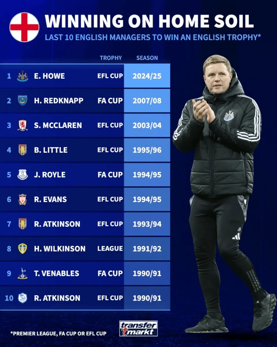 3月18日訊 紐卡在昨晚的聯(lián)賽杯決賽2-1擊敗利物浦,埃迪-豪也成為近年來首位帶隊(duì)捧得國內(nèi)冠軍的英格蘭本土主帥。