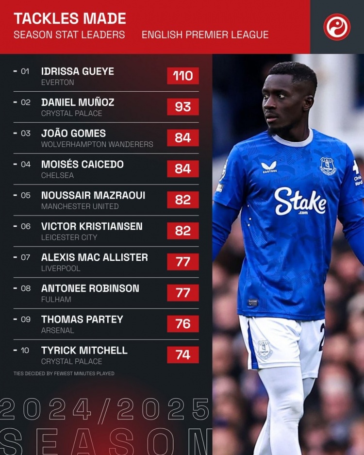 3月18日訊 國家隊比賽周到來,英超也暫時告一段落,squakwa統(tǒng)計了本賽季英超成功搶斷情況,蓋耶獨自領(lǐng)跑。