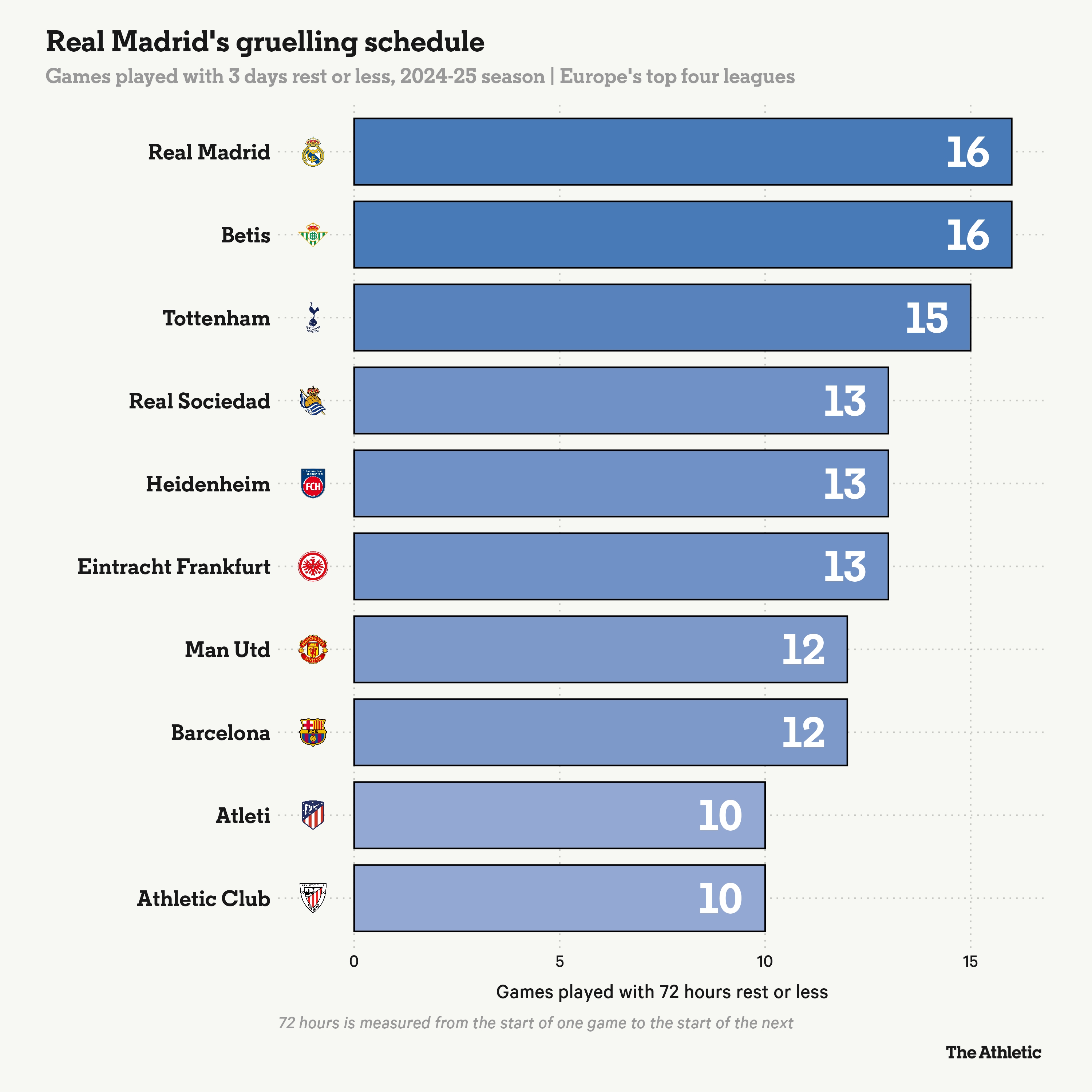 3月19日訊 根據(jù)The Athletic統(tǒng)計(jì),皇馬本賽季有16場比賽休息不多于72個(gè)小時(shí)。