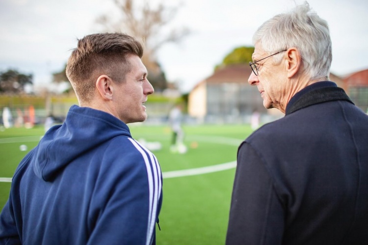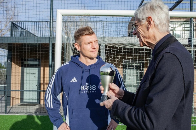 3月20日訊 目前擔任國際足聯(lián)全球足球發(fā)展主管的溫格造訪了克羅斯的青訓學校,并為他頒發(fā)了FIFA2024年度最佳陣容獎杯??肆_斯也更新社媒向溫格致謝。