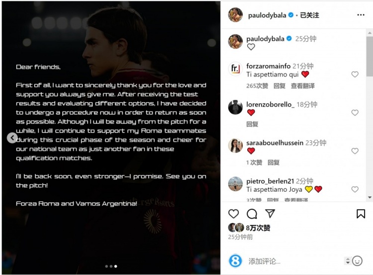 3月20日訊 羅馬官方確認迪巴拉肌腱受傷,將在未來幾天接受手術(shù)。迪巴拉社媒發(fā)文感謝球迷的支持,并表示很快就會回歸。