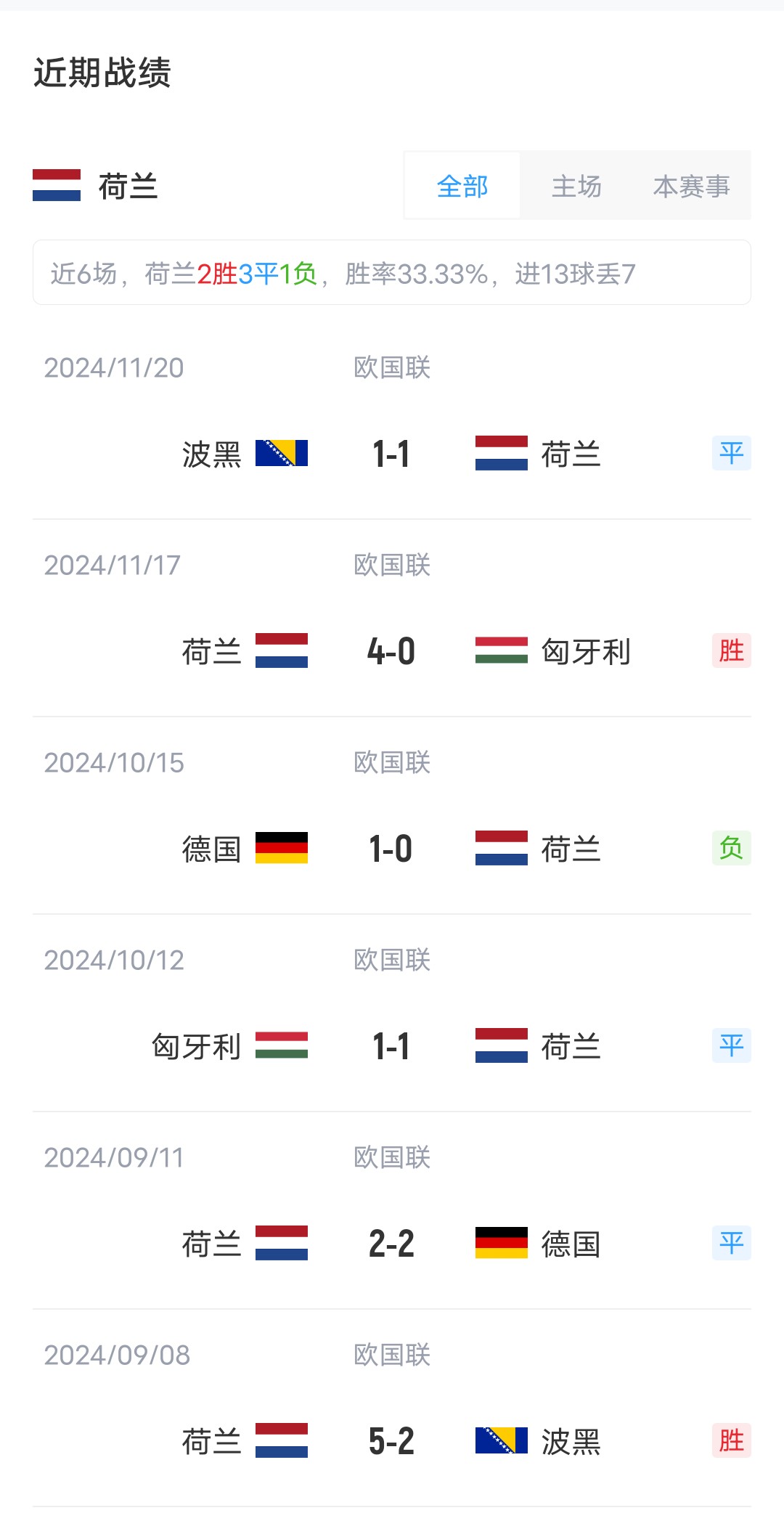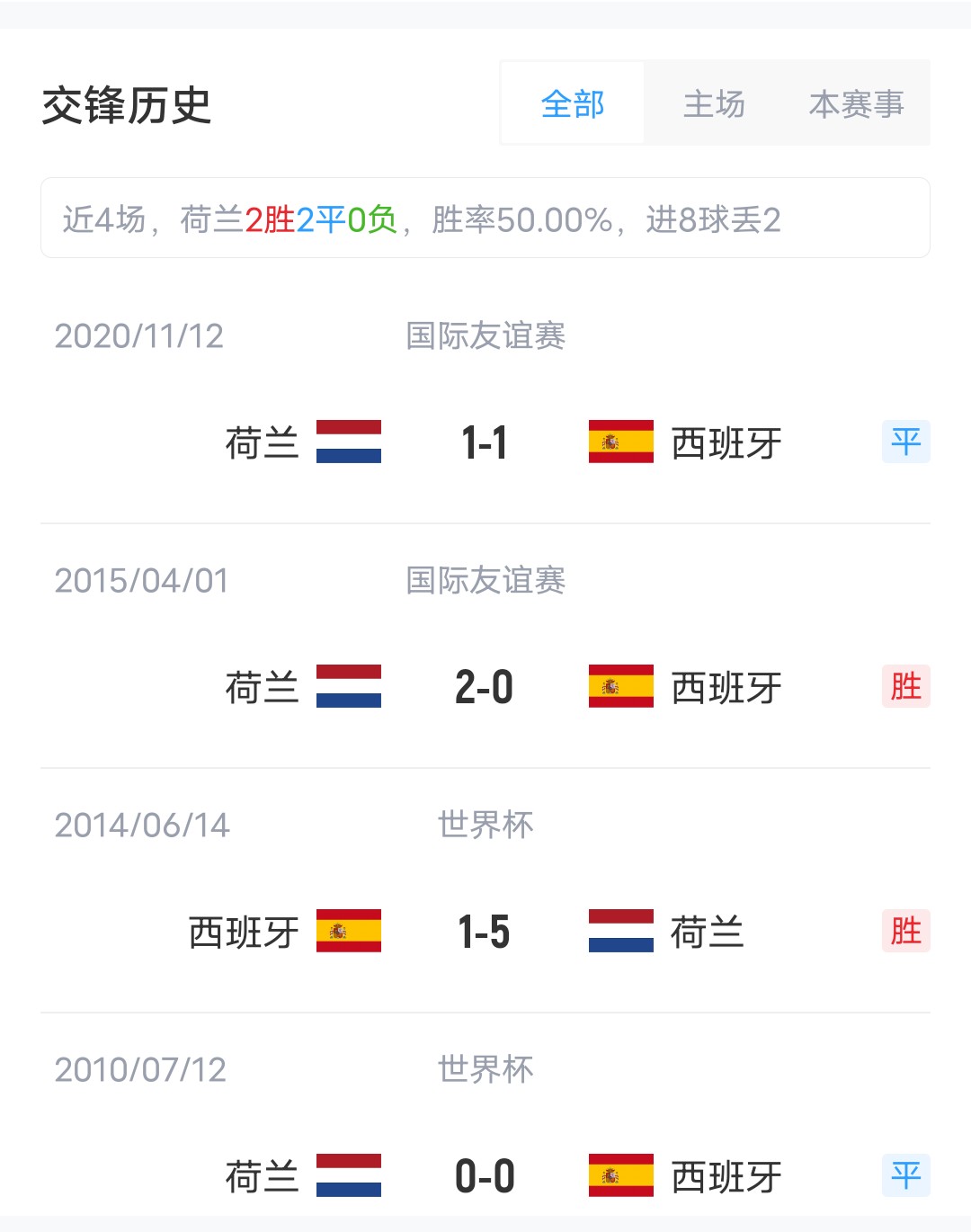 雙方近4場交鋒,荷蘭取得2勝2平的戰(zhàn)績稍居上風(fēng)。