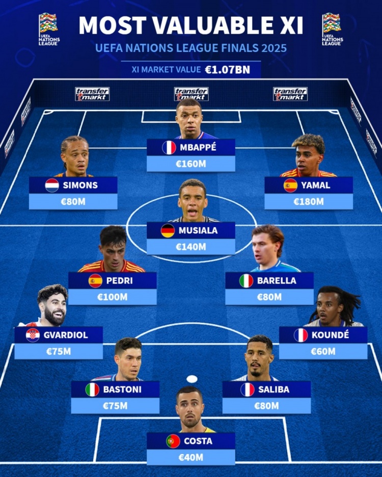 3月21日訊 德國轉(zhuǎn)會(huì)市場排出了歐國聯(lián)1/4決賽最貴陣容,姆巴佩、亞馬爾、穆西亞拉在列,總價(jià)10.7億歐元。