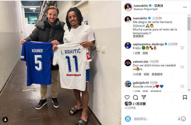 目前效力于哈伊杜克的拉基蒂奇社媒曬出與孔德互換球衣的照片,配文:“很高興見到你,我的兄弟孔德,祝你在本賽季余下的比賽中好運!”