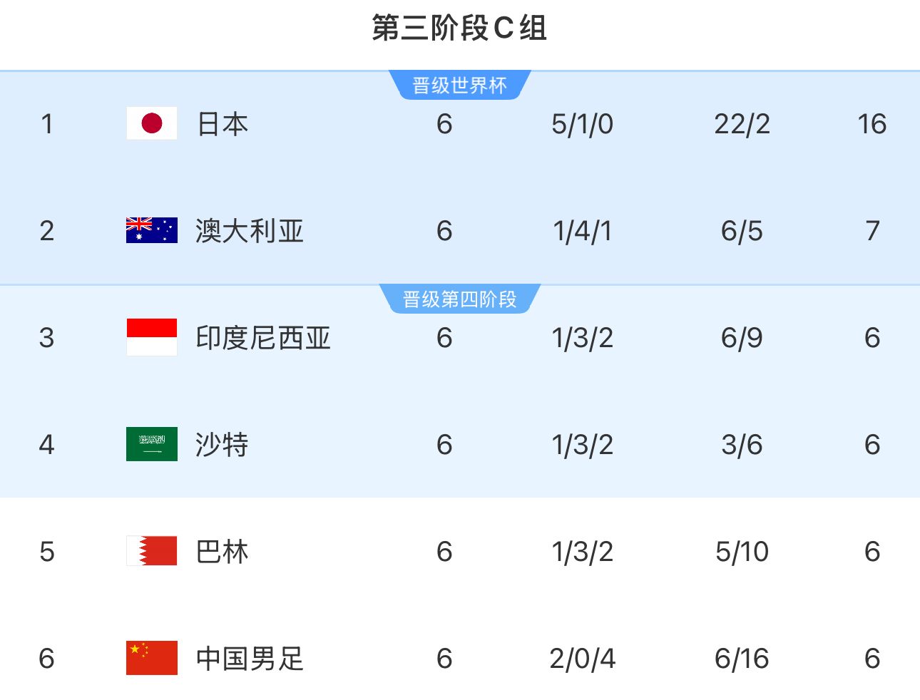18強(qiáng)賽C組第7輪,日本2-0巴林提前3輪直通世界杯,澳大利亞5比1印尼成為本組第二個拿到10分的球隊(duì),沙特在本組最后一場比賽中戰(zhàn)勝中國,率先拿到9分。