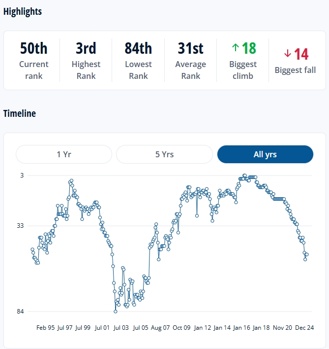 智利的FIFA排名曾在2016年達(dá)到隊史最高的第3名,從2021年開始,智利的排名就不斷下降,最低跌至過第53名,如今為第50名。