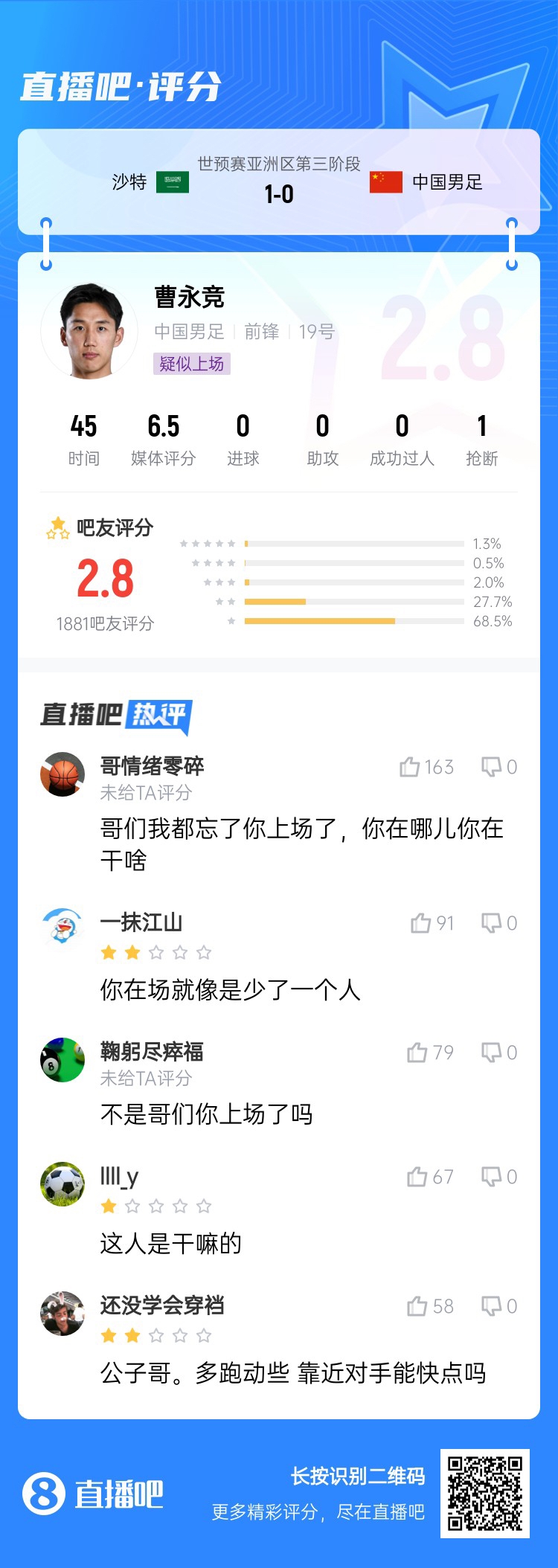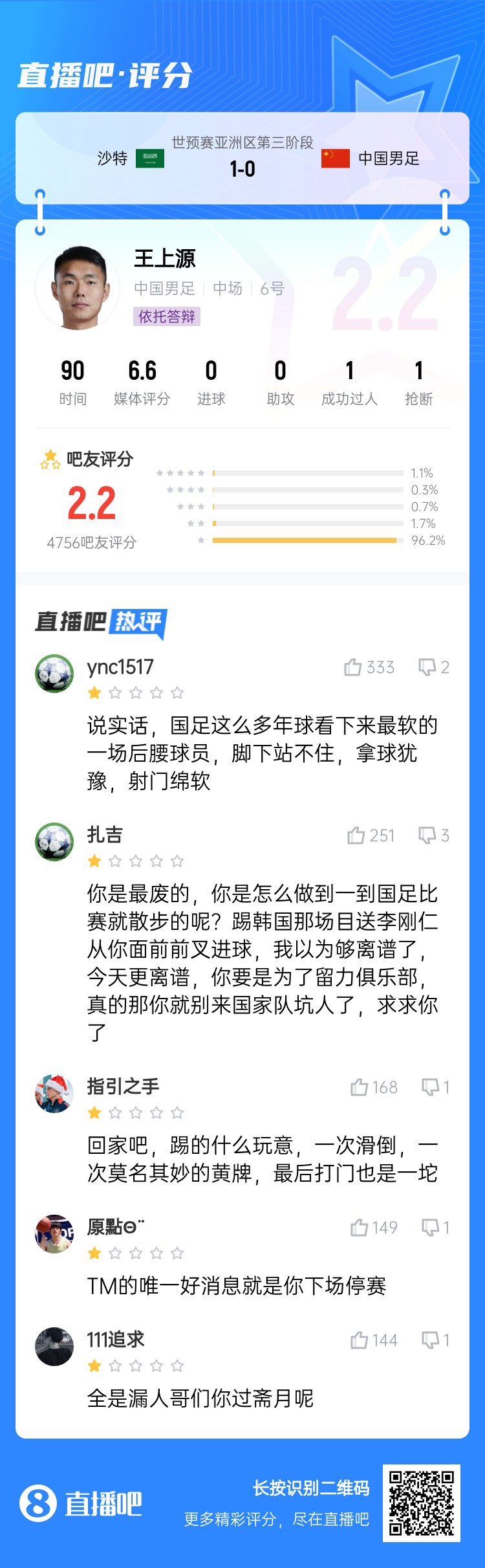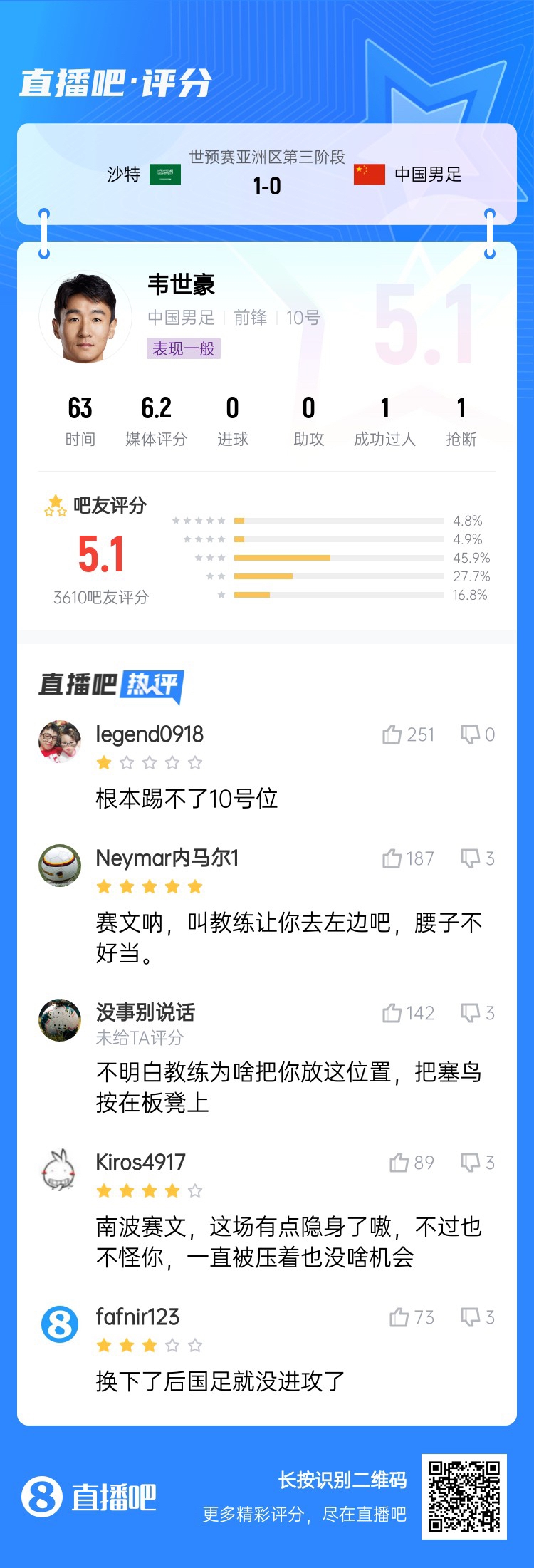 18強賽關(guān)鍵戰(zhàn),國足0-1不敵沙特,沒能擺脫小組墊底。吧友評分中,國足中場球員普遍低分,韋世豪5.1分,王上源2.2分,曹永競2.8分,謝文能5.9分。