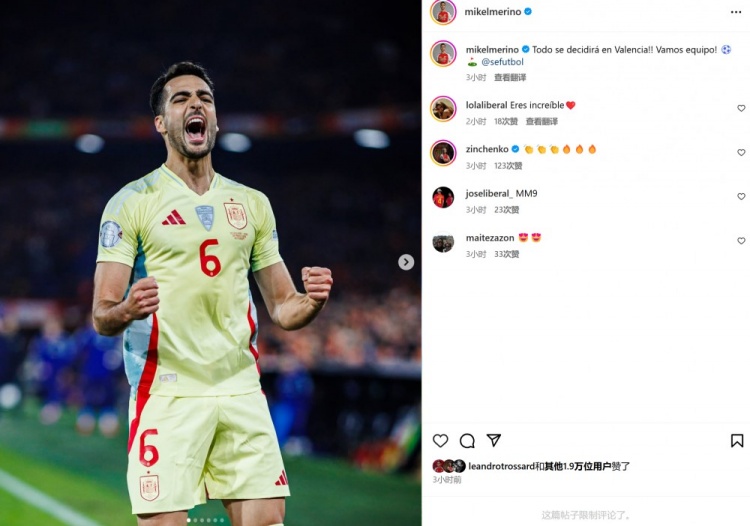 本場比賽梅里諾替補登場在傷停補時階段打進絕平進球,這也是他繼對陣切爾西打進制勝球后連場破門。賽后他也在社媒曬出慶祝照,配文寫道:“一切將在瓦倫西亞決定,讓我們一起加油!”