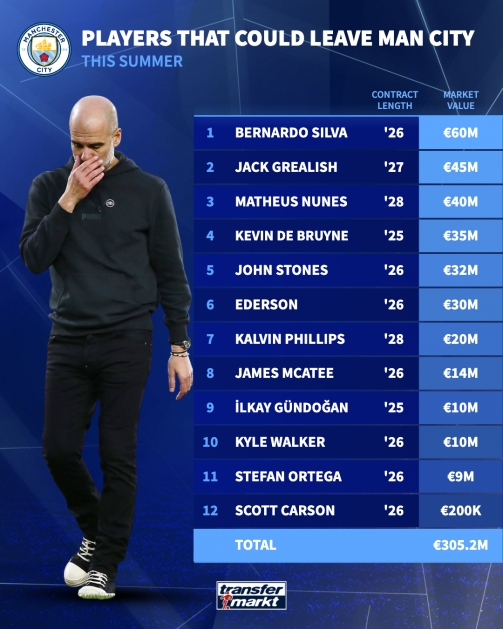 02月24日訊 有英國媒體消息稱,曼城準(zhǔn)備大換血清洗多名球員。德國轉(zhuǎn)會市場根據(jù)曼城球員的合約狀態(tài),匯總了可能離隊的球員身價。